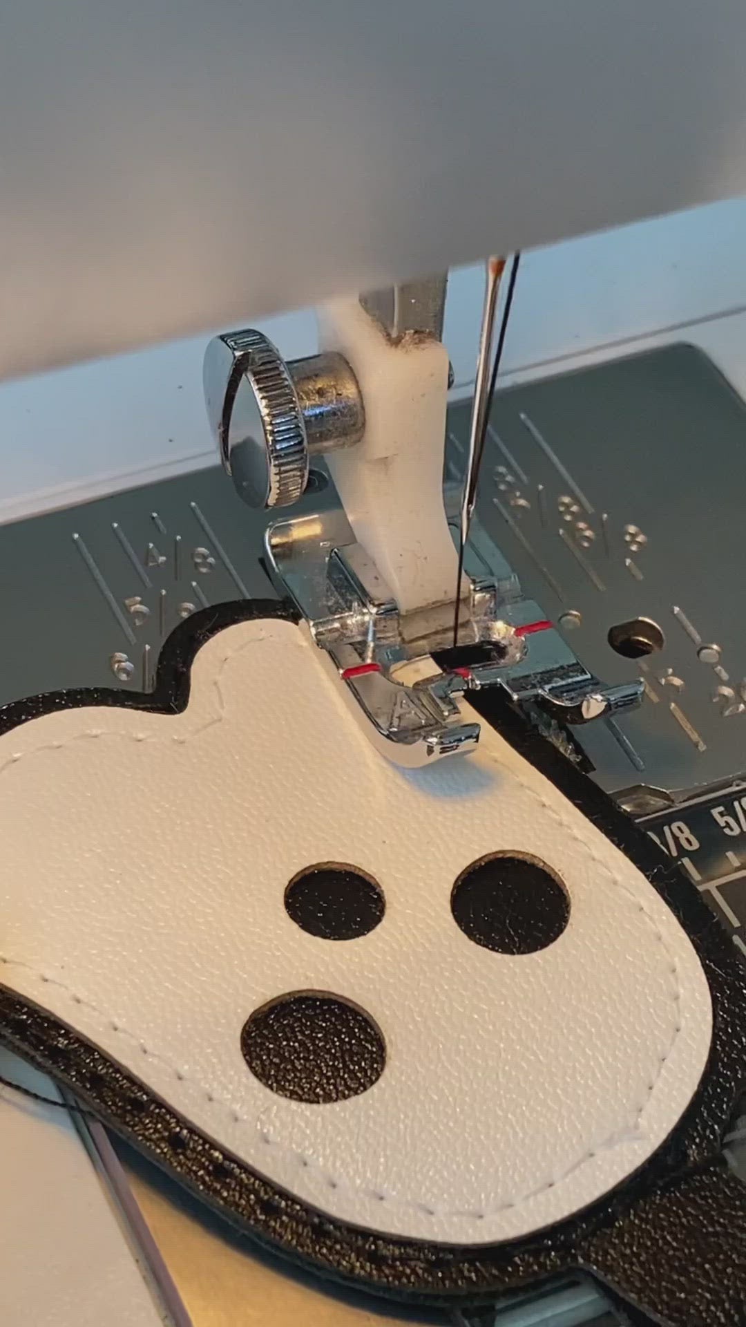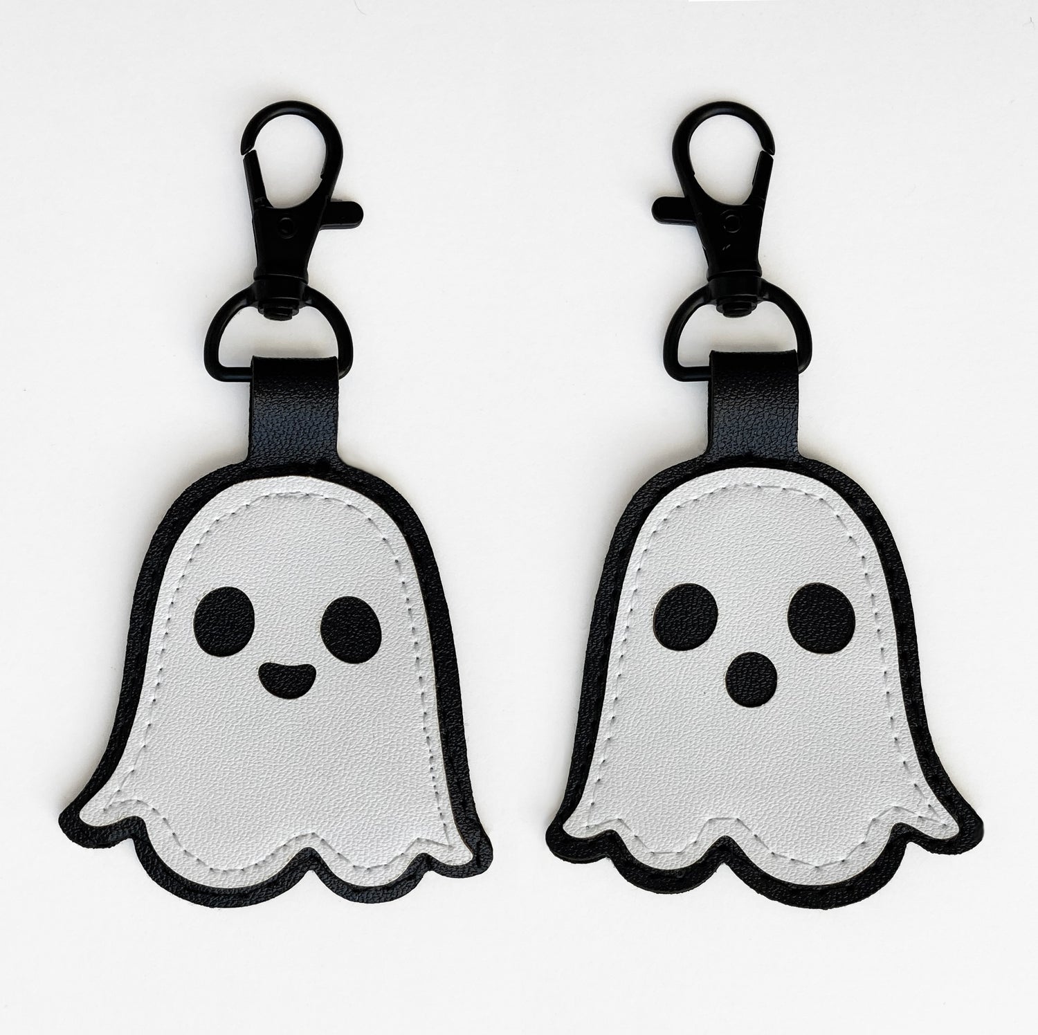 Haunt away with these double sided ghost keychains! This is hand-made from faux leather connected by white and black stitching attached to a black keyring-clip.
