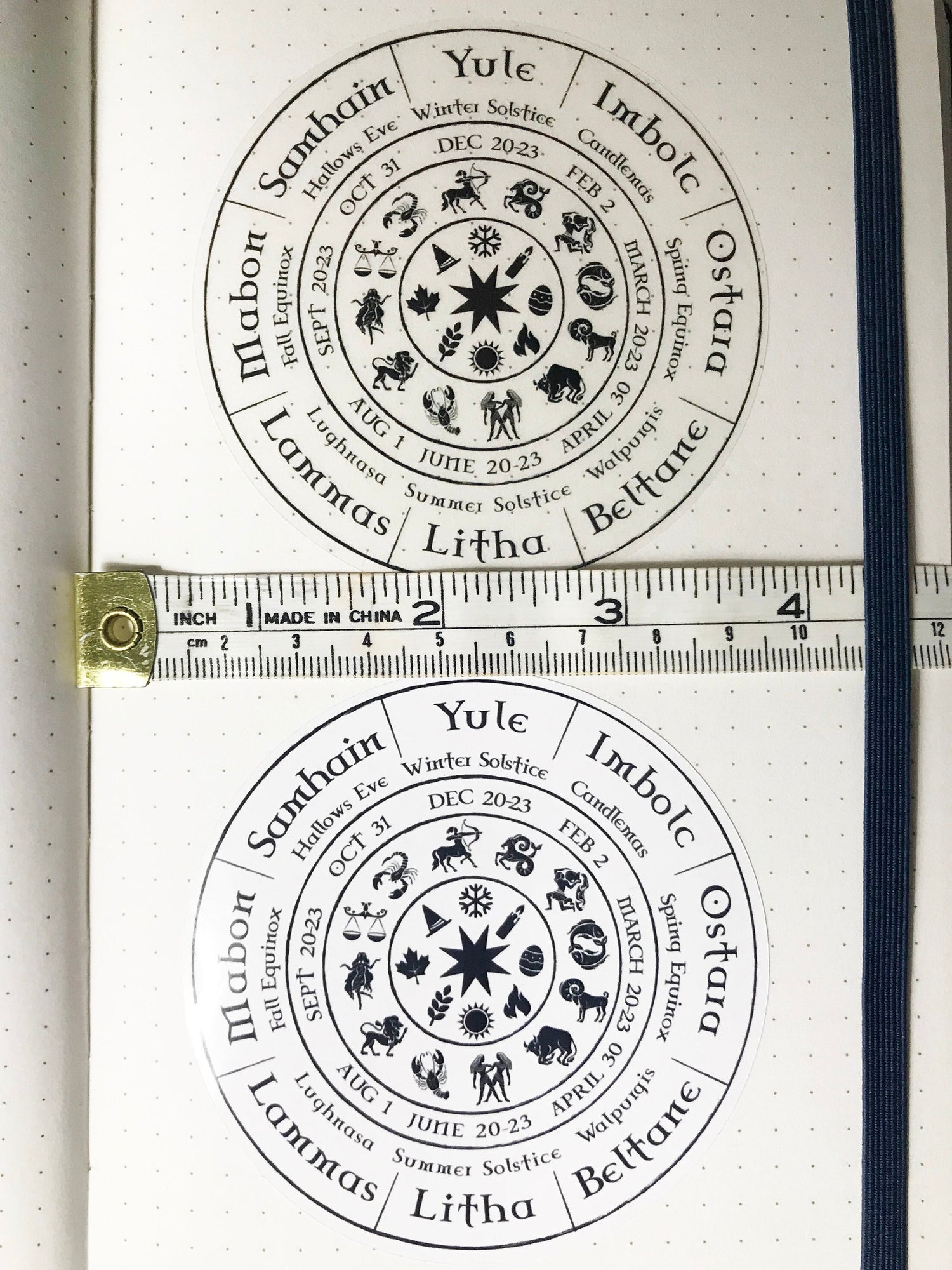 This shows the eight Sabbats, zodiacs, and seasonal symbols. 3.5 inches x 3.5 inches, great size to fit in bullet journals.