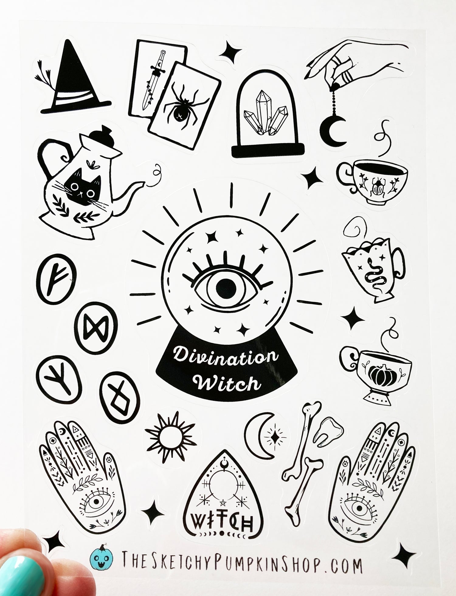 Divination Witch Sticker Sheet, Transparent, Black, Waterproof
