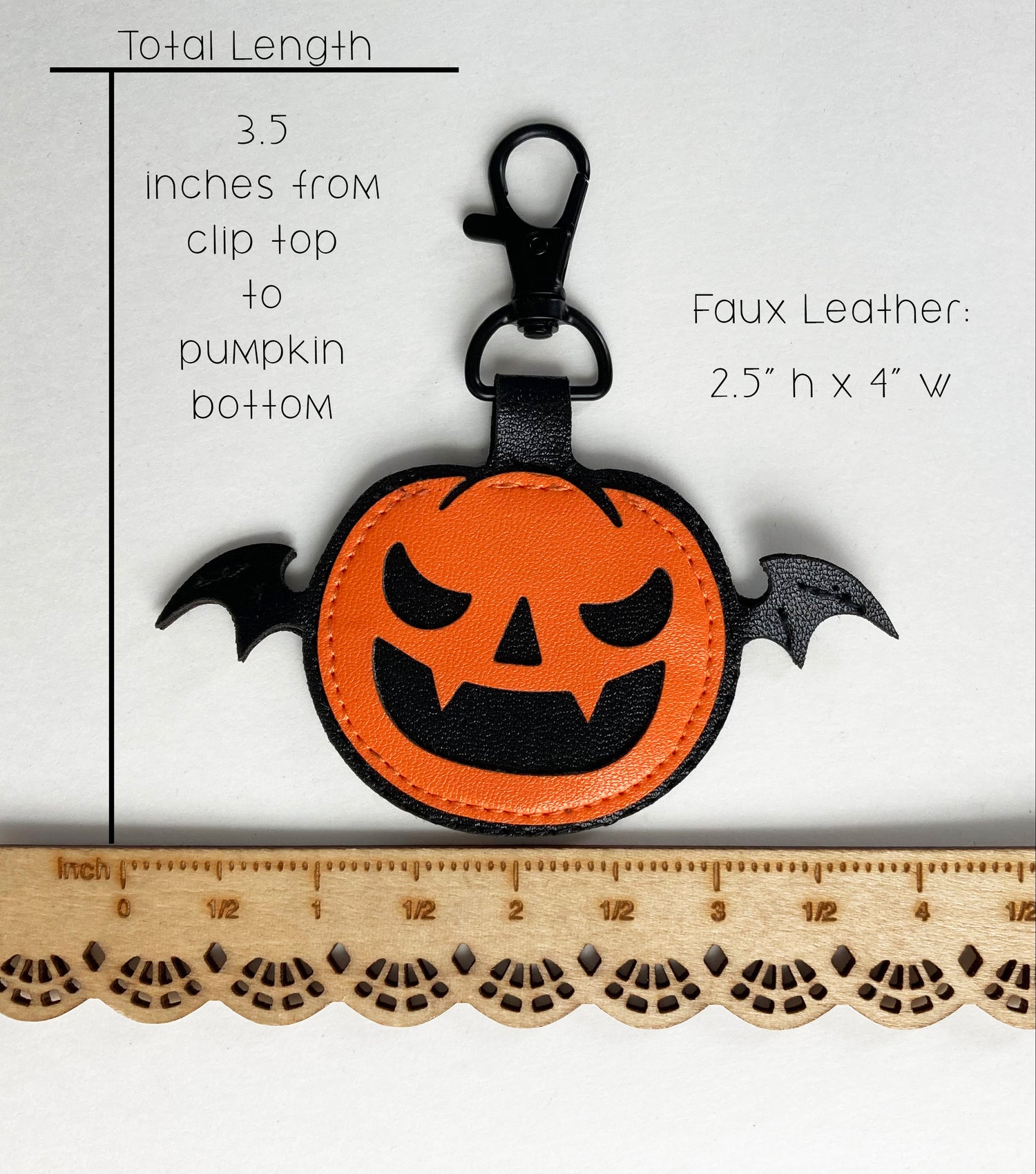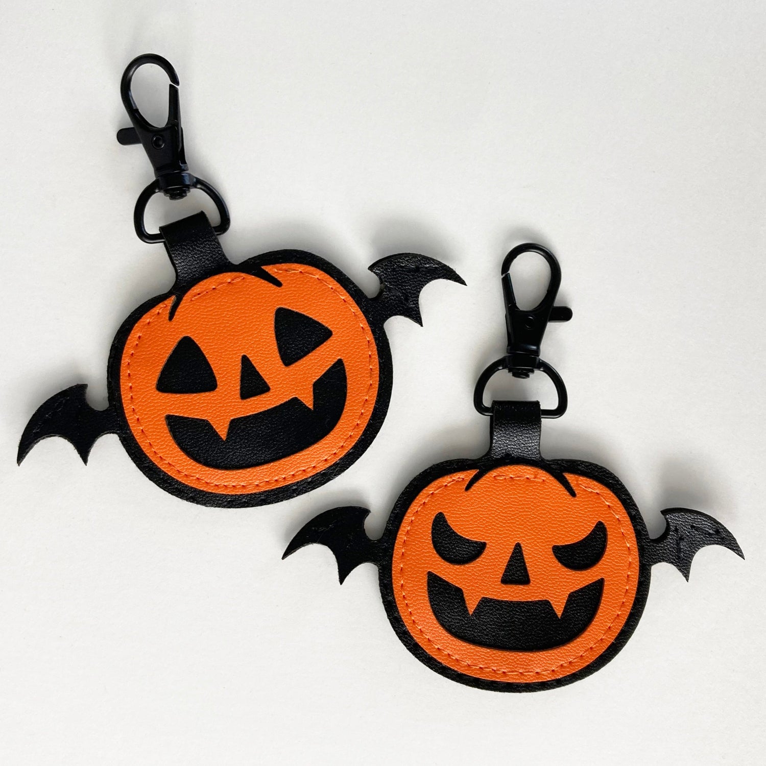 Fly away with this double sided pumpkin-bat keychain! This is hand-made from faux leather connected by orange and black stitching attached to a black keyring-clip.