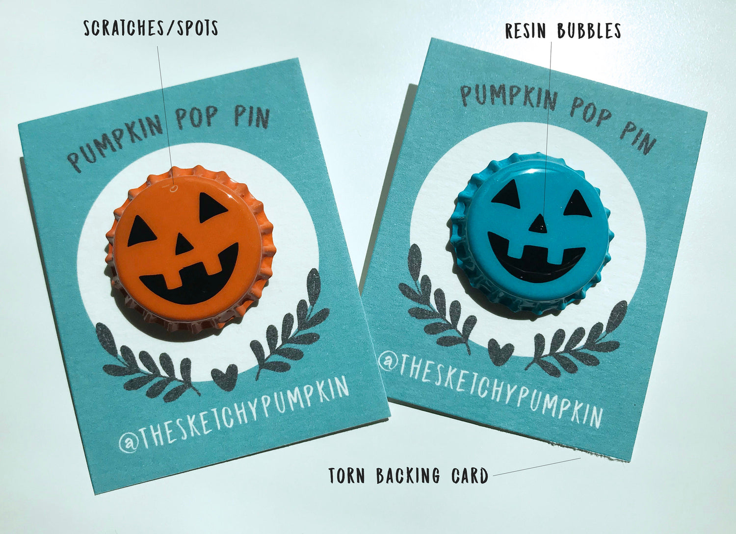 Misfit: Pumpkin Pop Pins. Pins, Lapel, B grade, Seconds, Halloween, Jackolantern, Pumpkin, Bottle Cap